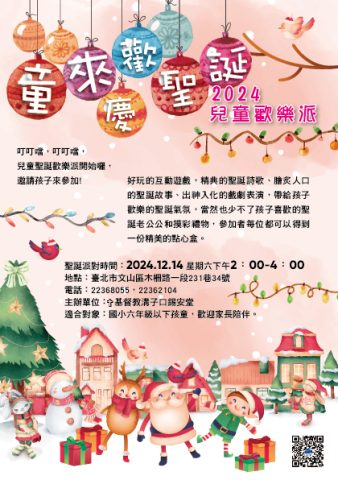 叮叮噹,叮叮噹,兒童聖誕歡樂派開始囉,邀請孩子來參加!好玩的互動遊戲,精典的聖誕詩歌、膾炙人口的聖誕故事、出神入化的戲劇表演,帶給孩子歡樂的聖誕氣氛,當然也少不了孩子喜歡的聖誕老公公和摸彩禮物,參加者每位都可以得到一份精美的點心盒。 適合對象:國小六年級以下孩童,歡迎家長陪伴。 聖誕派對時間:2024.12.14星期六下午2:00-4:00 地點:台北市文山區木柵路一段231巷34號 主辦單位:基督教溝子口錫安堂 電話:22368055,22362104