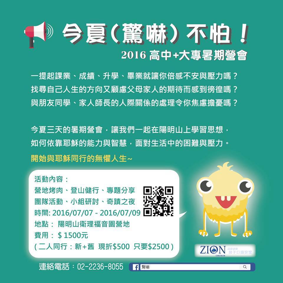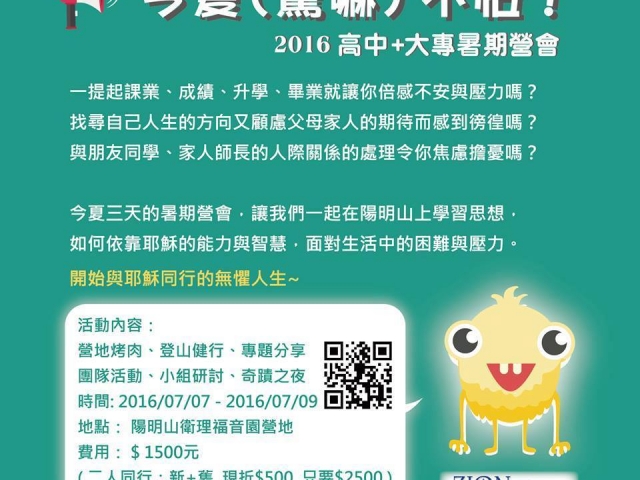 高中、大專團契每年暑假都會上陽明山舉辦暑期營會,但今年的計畫被颱風打亂,以致延後到八月舉辦,恰逢教會整修完畢,大家都期待留在新會堂舉行。每年營會,是大家放下俗務,專心追求神、經歷神的時刻!不少人在暑期營會裡經歷到神,更堅固了對神的信心!