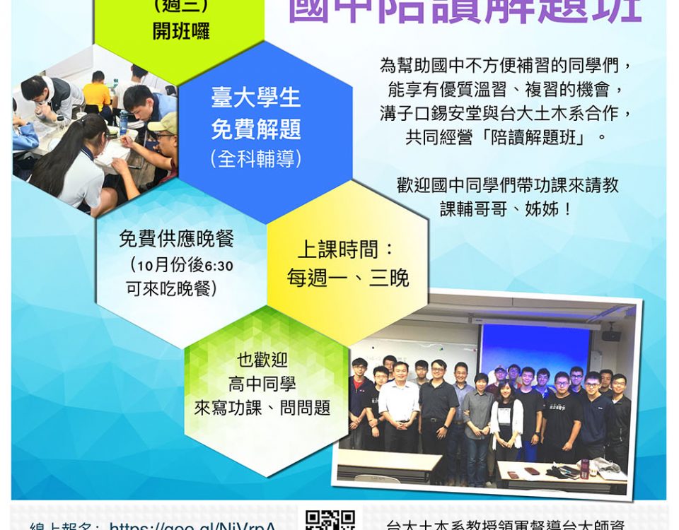 為幫助國中不方便補習的同學們,能享有優質溫習、複習的機會, 溝子口錫安堂與台大土木系合作,共同經營「陪讀解題班」。